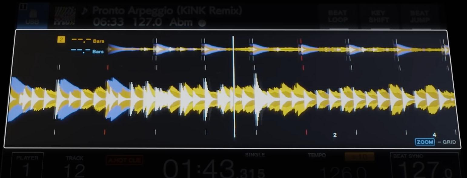 A lejátszó támogatja az új fajta 3 színű hullámformát. Felül látható a 2000NXS2-vel azonos fázis mérő és a hozzá tartozó beat számláló. Újdonság a CDJ-3000 -esen, hogy ezt átválthatjuk hullámforma módra és akkor a MASTER lejátszón szóló track aktuális waveform részletét jeleníti meg, a középső nagy waveform ZOOM-jával megegyező nagyításban.