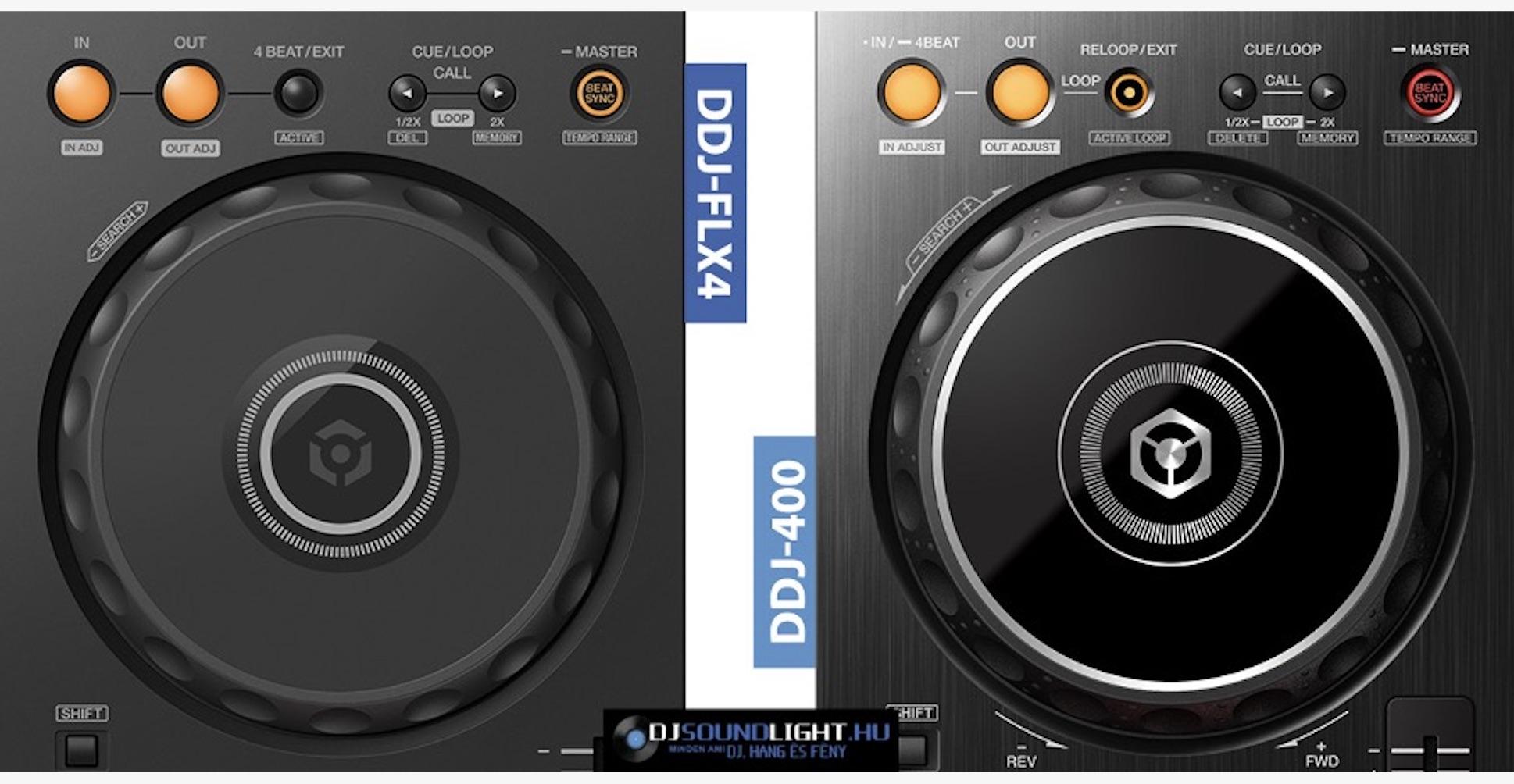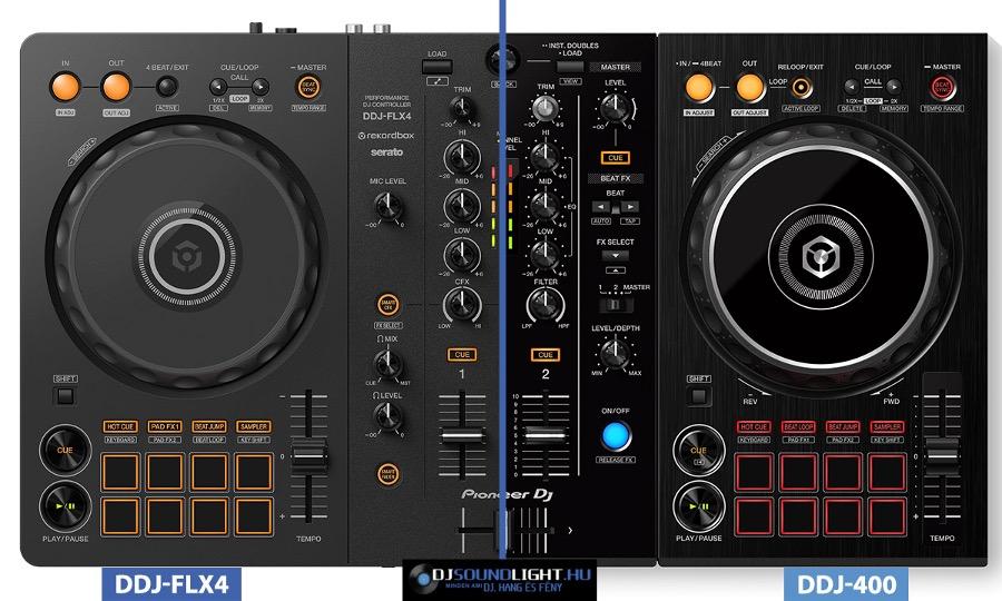 Külső méretekben a két controller teljesen megegyezik, kivéve, hogy az FLX4 sarkai lekerekítettek. Az FLX4 felülete matt fekete és a gombok háttérvilágítása sárga, a DDJ-400 pedig fényes felületű, piros és kék háttérvilágítással. A gombok és potméterek megegyeznek a két pulton. A Beat FX paraméter gomb párosa alulra került az FLX4-en.